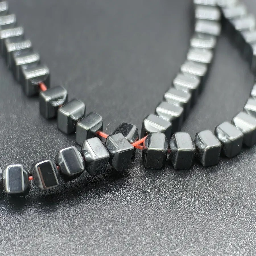 4 mm Gunmetal Beveled Cube Cut Hematite Natural Stone.Dimensions: 3.8 mm x 4.50 mm.Sold in strands.Each strand contains approximately 108 hematite stones.It is a natural hematite stone.Hematite is a shiny natural stone with a metallic appearance, believed to affect the root chakra.It is thought to provide energy, courage, and joy to the user while relieving stress.Hematite stones can be used in the design of bracelets, necklaces, and earrings.