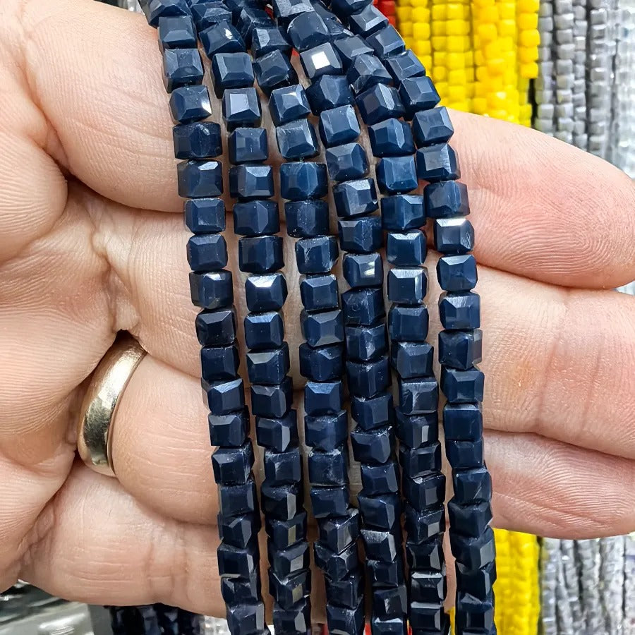 Cube Cut Crystal Beads. Dimensions: 4mm. Sold in a single strand. Each strand contains approximately 92 beads. Crystal beads can be used in necklace bracelet and anklet designs. Crystal beads are made from glass. Their faceted cuts reflect light giving them a shiny appearance. Avoid contact with chemicals and perfume for long-term use. Contains no harmful materials. Colors may vary depending on screen settings and ambient light.
