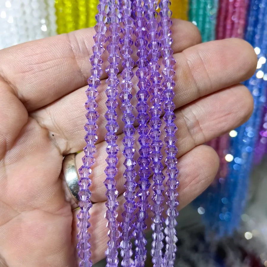 4mm Pyramid Cut Crystal Bead. 4mm. Sold in a single strand. Each strand contains approximately 85 - 90 beads. Hole diameter is 1mm. Crystal beads can be used in necklace bracelet and anklet designs. Crystal beads are made from glass. Their faceted cuts reflect light giving them a shiny appearance. Avoid contact with chemicals and perfume for long-term use. Contains no harmful materials. Colors may vary depending on screen settings and ambient light.