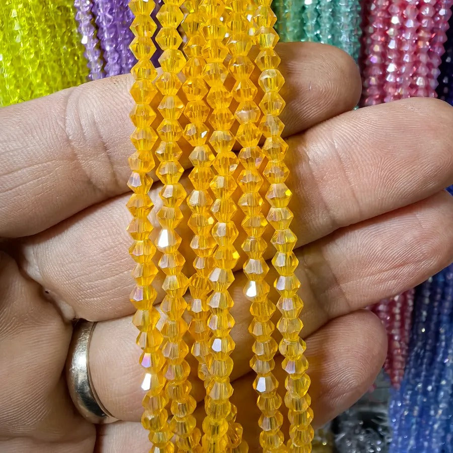 4mm Pyramid Cut Crystal Bead. 4mm. Sold in a single strand. Each strand contains approximately 85 - 90 beads. Hole diameter is 1mm. Crystal beads can be used in necklace bracelet and anklet designs. Crystal beads are made from glass. Their faceted cuts reflect light giving them a shiny appearance. Avoid contact with chemicals and perfume for long-term use. Contains no harmful materials. Colors may vary depending on screen settings and ambient light.