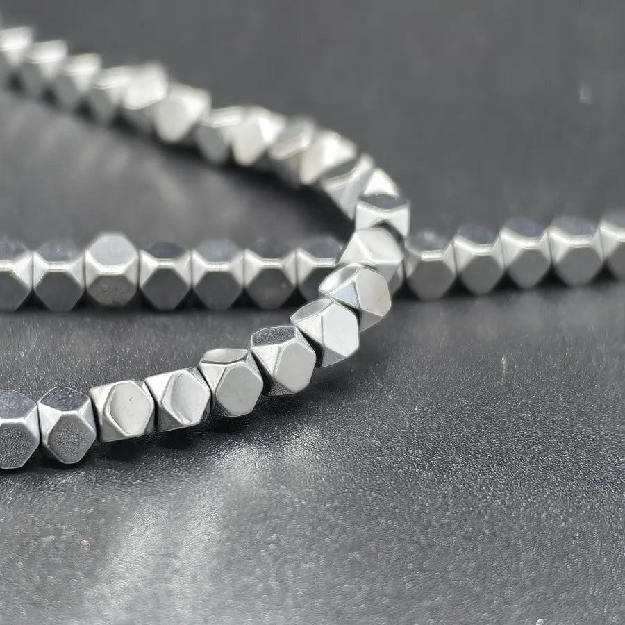 4 mm Silver Hexagonal Hematite Natural Stone.Dimensions: 4 mm x 4 mm.Sold in strands.Each strand contains approximately 102 hematite stones.It is a natural hematite stone.Hematite is a shiny natural stone with a metallic appearance, believed to affect the root chakra.It is thought to provide energy, courage, and joy to the user while relieving stress.Hematite stones can be used in the design of bracelets, necklaces, and earrings.