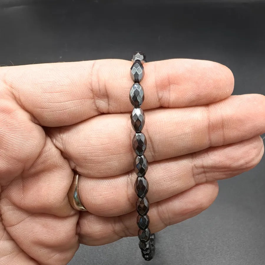 8 mm Gunmetal Faceted Barrel Cut Hematite Natural Stone.Dimensions: 5 mm x 8 mm.Sold in strands.Each strand contains approximately 47 hematite stones.It is a natural hematite stone.Hematite is a shiny natural stone with a metallic appearance, believed to affect the root chakra.It is thought to provide energy, courage, and joy to the user while relieving stress.Hematite stones can be used in the design of bracelets, necklaces, and earrings.