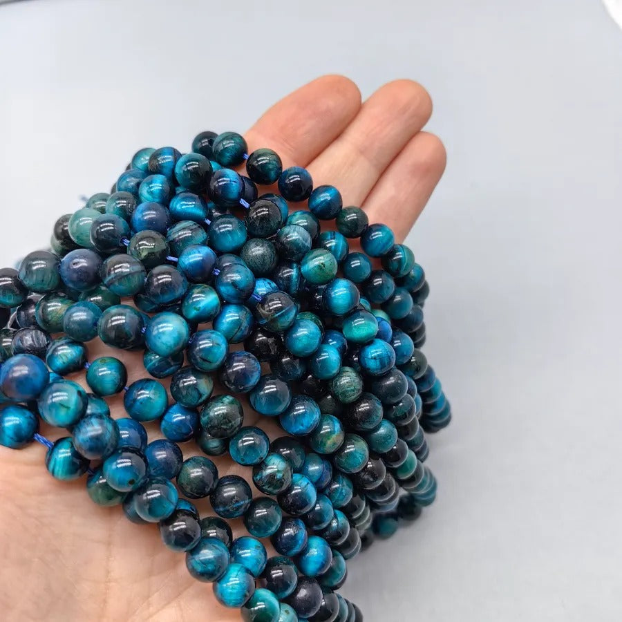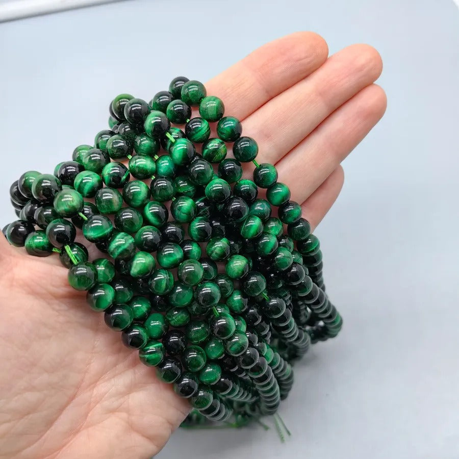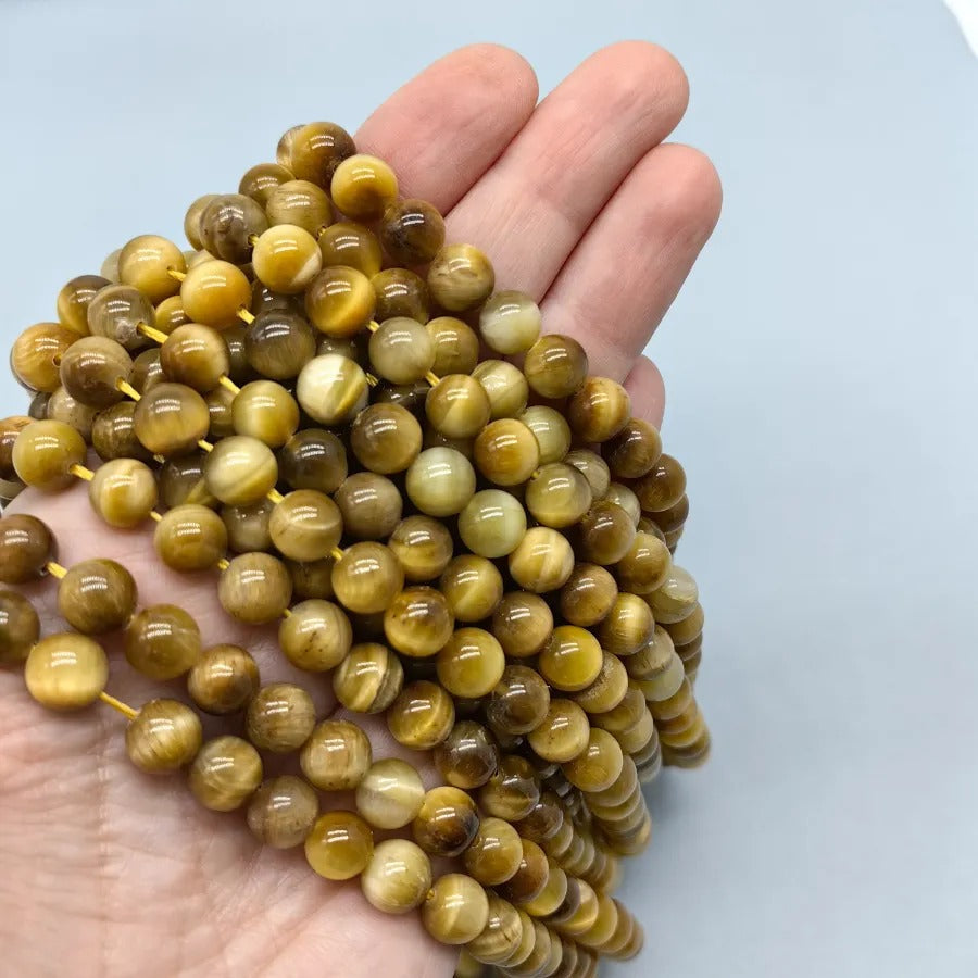 6 mm Colored Tiger Eye Round Cut Natural Stone Strand. Strand price. Approximately 65 stones per strand. Natural stones may contain different patterns veins and colors depending on the source. Colors may vary slightly due to light and camera settings.