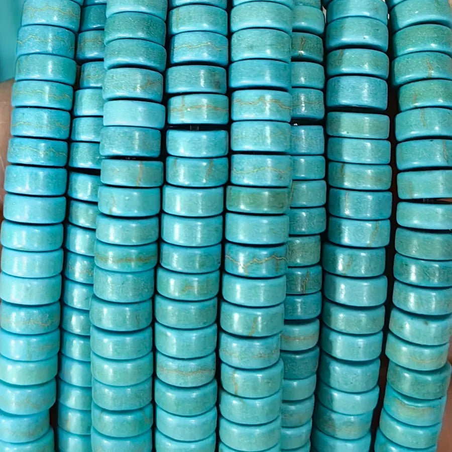 6 mm Disk Turquoise Turquoise Stone Natural Stone. Strand price. Approximately 130 stones per strand. Natural stones may contain different patterns veins and colors depending on the source. Colors may vary slightly due to light and camera settings.