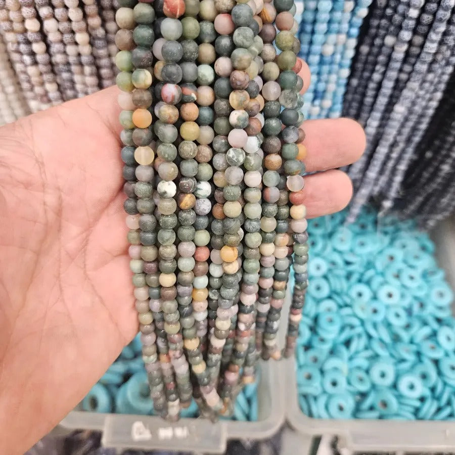 6 MM Green and Khaki Mix Matte Agate Natural Stone Strand. Strand price. Approximately 64 stones per strand. Natural stones may contain different patterns veins and colors depending on the source. Colors may vary slightly due to light and camera settings.