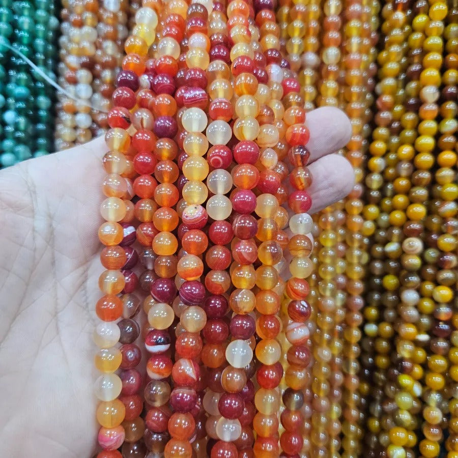 6 MM Orange Agate Natural Stone Strand. Strand price. Approximately 64 stones per strand. Natural stones may contain different patterns veins and colors depending on the source. Colors may vary slightly due to light and camera settings.