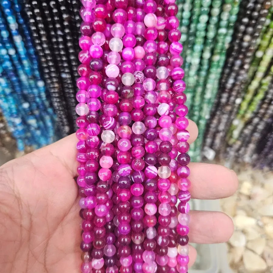 6 MM Shiny Black Veined Purple Agate Natural Stone Strand. Strand price. Approximately 64 stones per strand. Natural stones may contain different patterns veins and colors depending on the source. Colors may vary slightly due to light and camera settings.