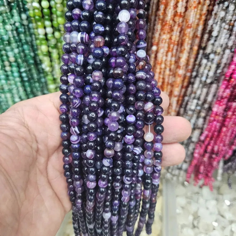 6 MM Purple Veined Agate Natural Stone Strand. Strand price. Approximately 64 stones per strand. Natural stones may contain different patterns veins and colors depending on the source. Colors may vary slightly due to light and camera settings.