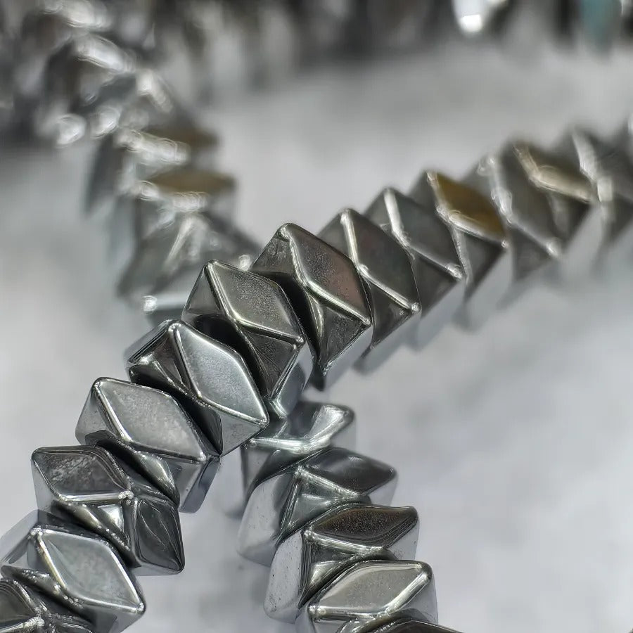 6 mm Square Edged Silver Rondelle Hematite Natural Stone. Dimensions: 3 mm x 6 mm. Sold in strands. Each strand contains approximately 128 pieces of hematite. It is a Natural Hematite Stone. Hematite is a shiny, metallic natural stone, believed to affect the root chakra. It is thought to provide energy, courage, joy, and relieve stress. It can be used in the design of bracelets, necklaces, and earrings.