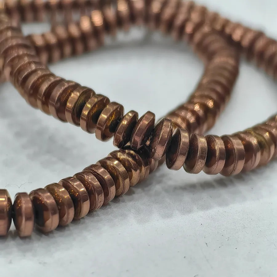 8 mm Copper Rondelle UFO Cut Hematite Natural Stone. Dimensions: 8 mm x 2 mm. Sold as a single strand. Each strand contains approximately 115 stones. It is a natural Hematite stone. Hematite is a shiny natural stone with a metallic appearance, believed to influence the root chakra. It is thought to provide energy, courage, and joy to the wearer while alleviating stress. Hematite stones can be used in the designs of bracelets, necklaces, earrings, and other jewelry.
