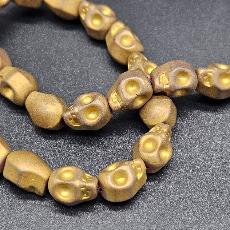 8 mm Matte Gold Skull Cut Hematite Natural Stone. Dimensions: 8 mm. Sold as a single strand. Each strand contains approximately 40 skulls. It is a natural Hematite stone. Hematite is a shiny natural stone with a metallic appearance, believed to influence the root chakra. It is thought to provide energy, courage, and joy to the wearer while alleviating stress. Hematite stones can be used in the designs of bracelets, necklaces, earrings, and other jewelry.