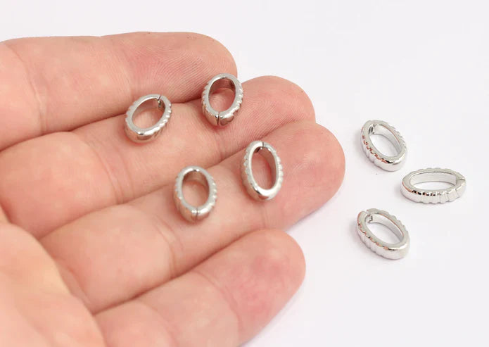 Silver Color Rhodium Plated Bracelet, Necklace Oval Clip with Stripe on it, Oval Clip. Dimensions: 9x13mm Price is for 5 Pieces. Rhodium plated on brass. A Quality product, resistant to rust and tarnishing. Do not contact with chemicals and perfumes for long-term use. Passed all tests, does not contain harmful materials. Colors may vary depending on screen settings and ambient light.