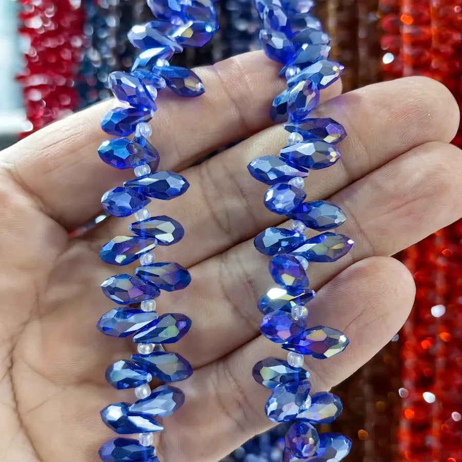 Teardrop Cut Crystal Beads. Dimensions: 6mm x 12mm. Sold in a single strand. Each strand contains approximately 92 beads. Crystal beads can be used in necklace bracelet and anklet designs. Crystal beads are made from glass. Their faceted cuts reflect light giving them a shiny appearance. Avoid contact with chemicals and perfume for long-term use. Contains no harmful materials. Colors may vary depending on screen settings and ambient light.