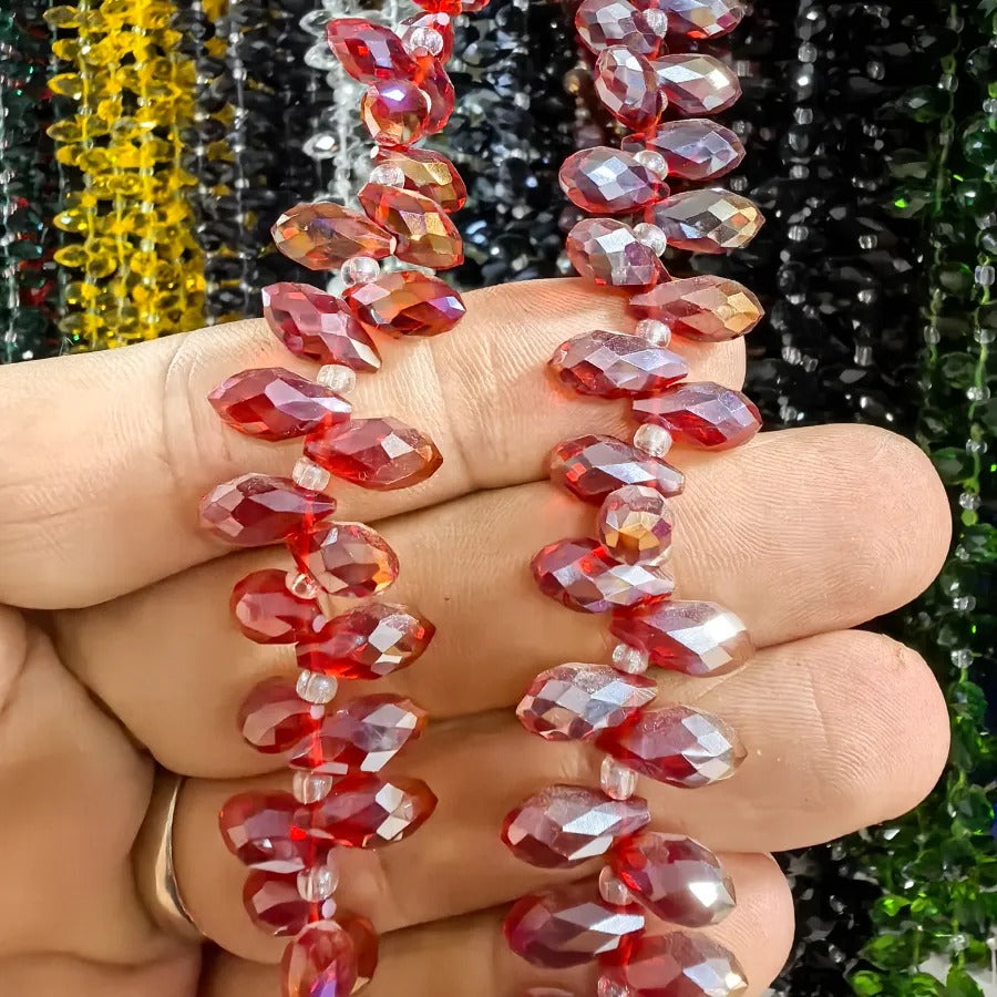 Teardrop Cut Crystal Beads. Dimensions: 6mm x 12mm. Sold in a single strand. Each strand contains approximately 92 beads. Crystal beads can be used in necklace bracelet and anklet designs. Crystal beads are made from glass. Their faceted cuts reflect light giving them a shiny appearance. Avoid contact with chemicals and perfume for long-term use. Contains no harmful materials. Colors may vary depending on screen settings and ambient light.